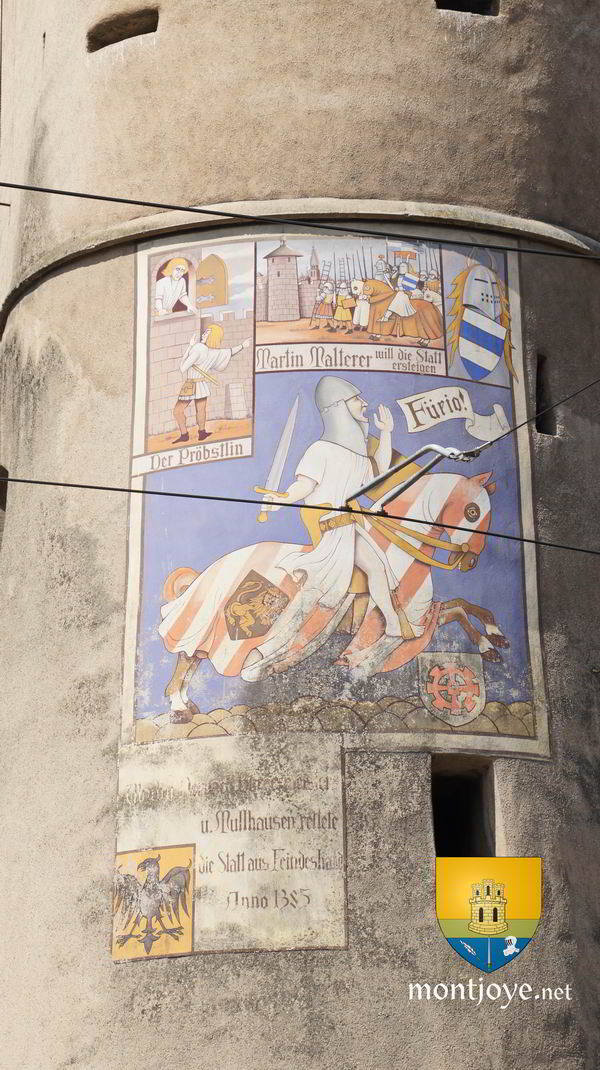 Les deux fresques : un aigle impérial est découvert en 1893 lors de création de la fresque du siège de Martin Malterer en 1385. Cet aigle impérial rappel l'indépendance de la ville, l'ensemble de la fresque fut restaurée en 1893 puis une nouvelle fois en 1970.