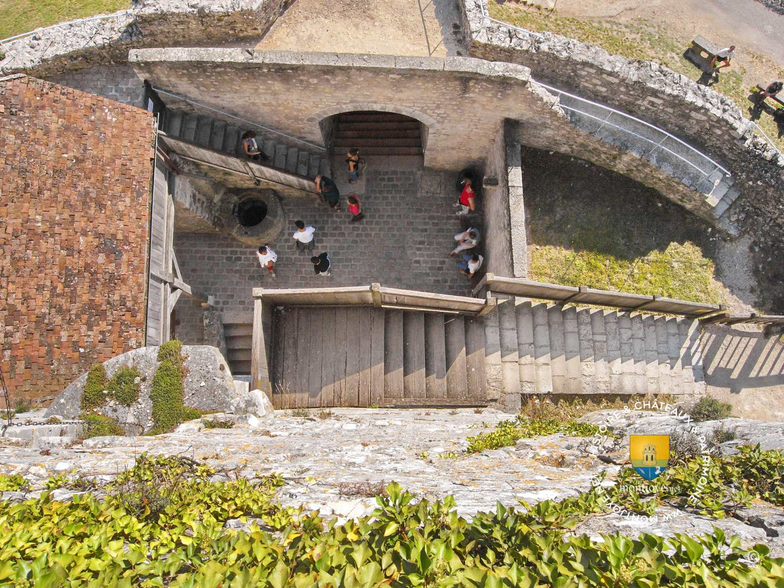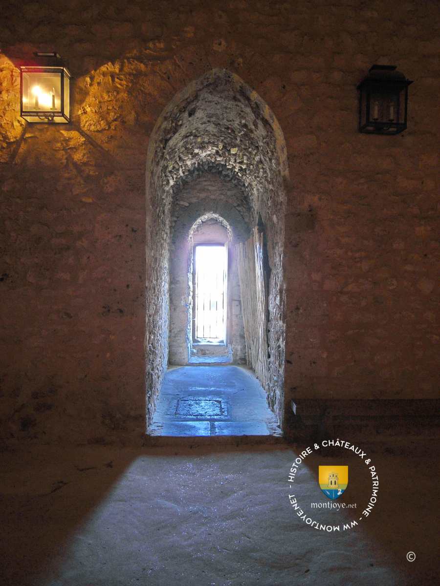 On entre aujourd'hui au Ier étage qui était en réalité la Salle Haute, qui fut probablement en partie la Salle des Gardes,, salle avec voûte formée de quatre arcades ogivales, appuyées sur quatre larges corbeaux saillants à une hauteur de 4,50 m, en dessous ce trouve le cellier. La salle des gardes est l'axe centrale de communication vers la chambre du Gouverneur ( avec cheminée ), la Salle Basse , les chemins de ronde et les prisons accessibles par des escaliers très étroit intégré dans l'épaisseur des murs.