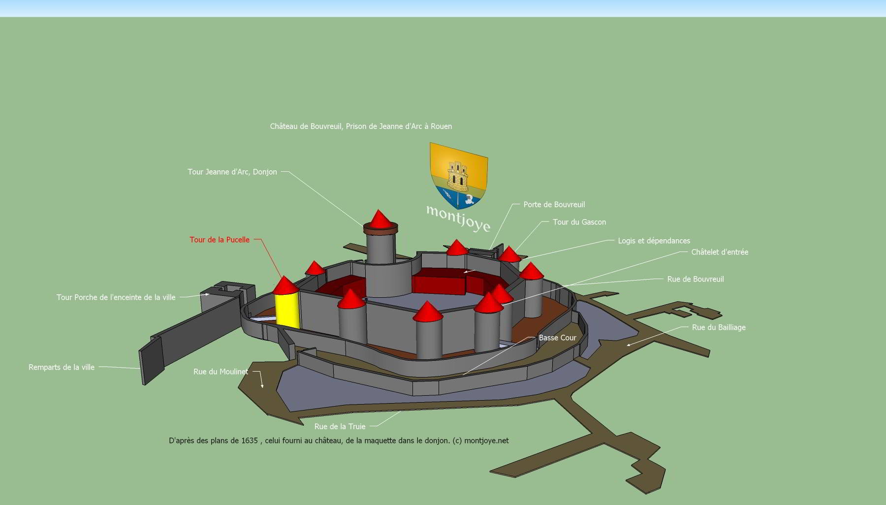 Plan du château de Bouvreuil en 3D, que j'ai réalisé à partir d'un plan de 1635, de la maquette du château et du plan fourni lors de la visite. Les toits des tours, notamment en poivrière, sont juste présents à titre esthétique, il n'est donc pas sûr que la représentation des toits soit juste, d'autant que selon les maquettes et dessins cela change beaucoup. Vous pouvez cliquer sur la photo pour l'agrandir, en jaune la tour des champs où fut enfermée Jeanne d'Arc le 25 décembre 1430 ( la tour va changer de nom par la suite en tour de la Pucelle , dont on voit ici des restes aujourd'hui ). Les rues présentes sont celles du Moyen-âge qui n'ont par ailleurs aucun lien avec les rues d'aujourd'hui, sauf en partie pour la rue du Bailliage et la rue de Bouvreuil.