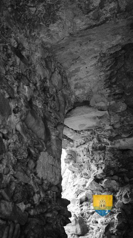 La meurtrière du bas, que je date du XIIe voire d'une date antérieure, ou du moins ce qu’il en reste, est assez intéressante de par sa construction. Notons d’abord son renfoncement au-dessus permettant à un archer de tirer. On peut constater aussi, à moins d’être un équilibriste ou contorsionniste hors pair, que l’angle de défense est particulièrement dirigé en un point précis. Il s’agit donc d’une indication assez évocatrice permettant au moins d’affirmer que la meurtrière défendait un point clef sans pour autant qu’on sache de quel élément, mais il s’agit probablement d’une porte, ouverture ou d’un système défensif particulièrement sensible. Il n’est pas impossible que la meurtrière du bas ne soit pas de la même époque que celle du dessus plus ancienne, les pierres ne semblent pas à vue d’œil être taillées de la même façon et être de la même composition. Ce qui expliquerait l’étrangeté du positionnement de la meurtrière.