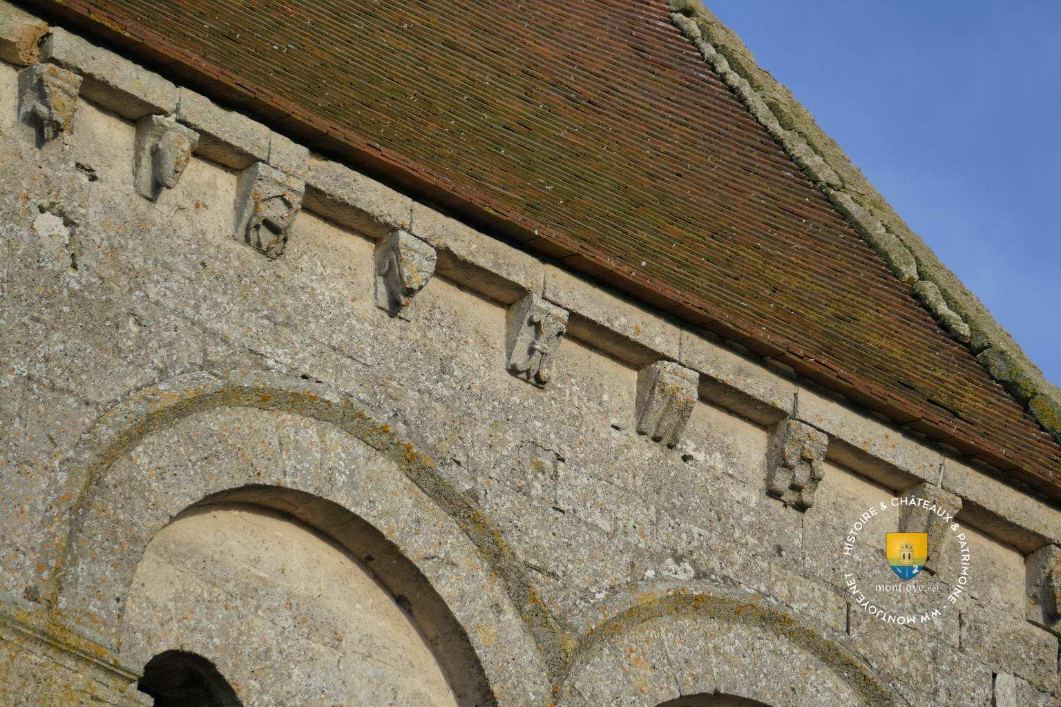 L’église comprend une nef, deux bas côtés, un transept surmonté d’un clocher et un chœur carré (6). Dans son état primitif, le sanctuaire devait s’arrondir en hémicycle, et le plan de l’édifice était conforme à celui de l’église de Bonnes (Aisne). La nef, recouverte d’un plafond, renferme quatre travées : sa construction peut remonter à l’année 1135 environ. Ses grands arcs en tiers-point, fermés d’un double rang de claveaux, s’appuient sur des massifs rectangulaires flanqués de deux pilastres, comme dans les églises de Chelles (Oise), de Cierges, de Courmelles, de Laffaux, de Saconin et de Sergy (Aisne). Les tailloirs qui reçoivent la retombée des aroades, sont ornés d’un listel, d’un cavet et d’une baguette. Six fenêtres en plein cintre, bouchées à l’époque moderne, s’ouvraient dans l’axe des piles, suivant une disposition déjà signalée à Pernant (Aisne), à Béthisy-Saint-Martin et Orrouy (Oise). On aperçoit une baie du même genre au-dessus de la porte principale (7). Les bas côtés, dépourvus de voûtes et reconstruits sans aucun art, ne méritent pas d’attirer l’attention.