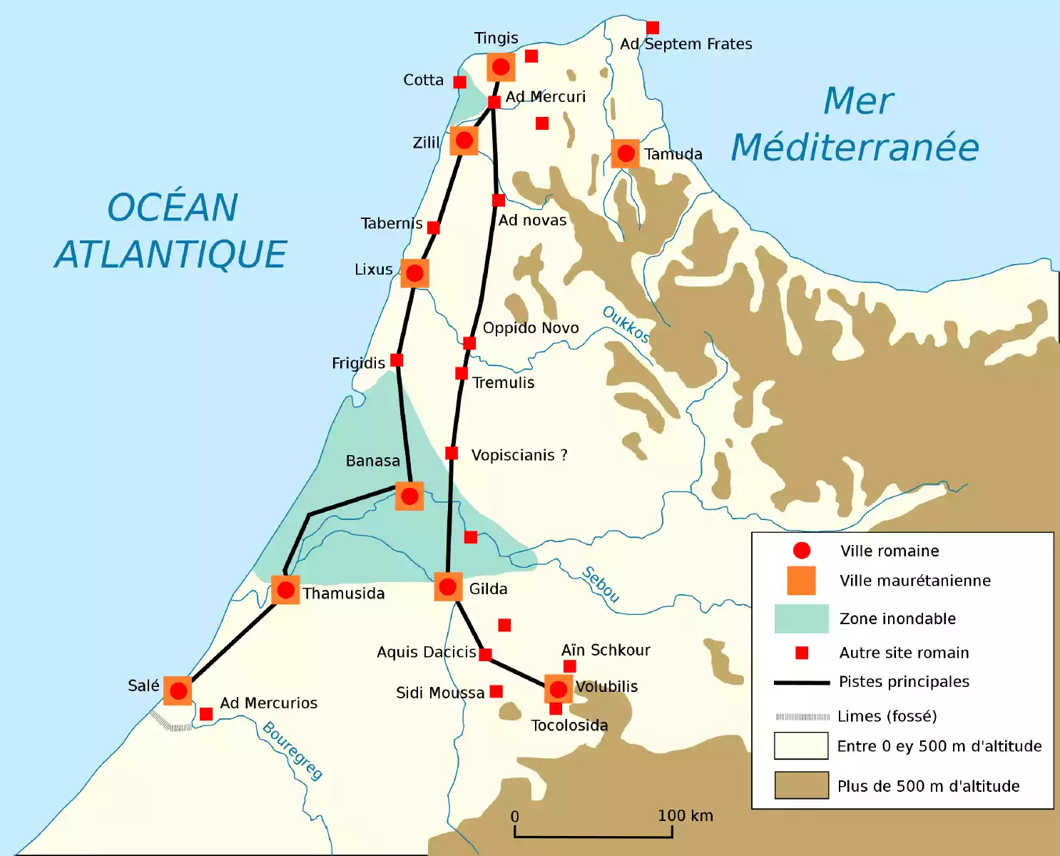 Volubilis est une ancienne cité berbère conquise par Rome au Ier siècle avant J-C. Située dans les plaines de Saiss, à proximité de Meknès et à 100 km de Sala ( Rabat aujourd'hui ), la cité devient prospère sous l'empire de Rome. La majorité des ruines actuelles de Volubilis proviennent de l'époque romaine. Contrairement à d'autres cités antiques du Maroc, elle se distingue par le fait qu'elle est située à l'intérieur des terres, tout comme Banasa, alors que des cités telles que Sala ( Rabat aujourd'hui ), Tingis (Tanger), Lixus (à Larache) et Septem se trouvent sur les côtes maritimes ou fluviale.